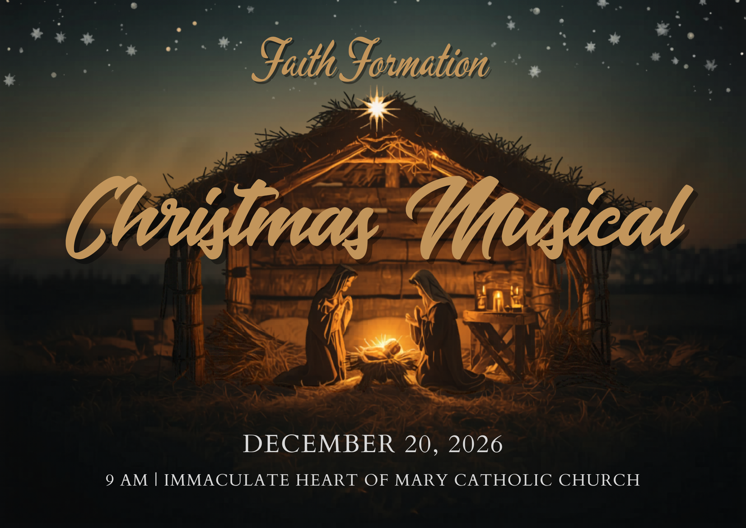 Faith Formation Christmas Musical 9:00 am MassFeaturedIHM Church 818 12th Street, Lafayette, LA, United StatesJoin us for the Faith Formation Christmas Musical on December 20, 2026 at the 9:00 AM Mass. Our students will share the joy of the Christmas season through song and […]
